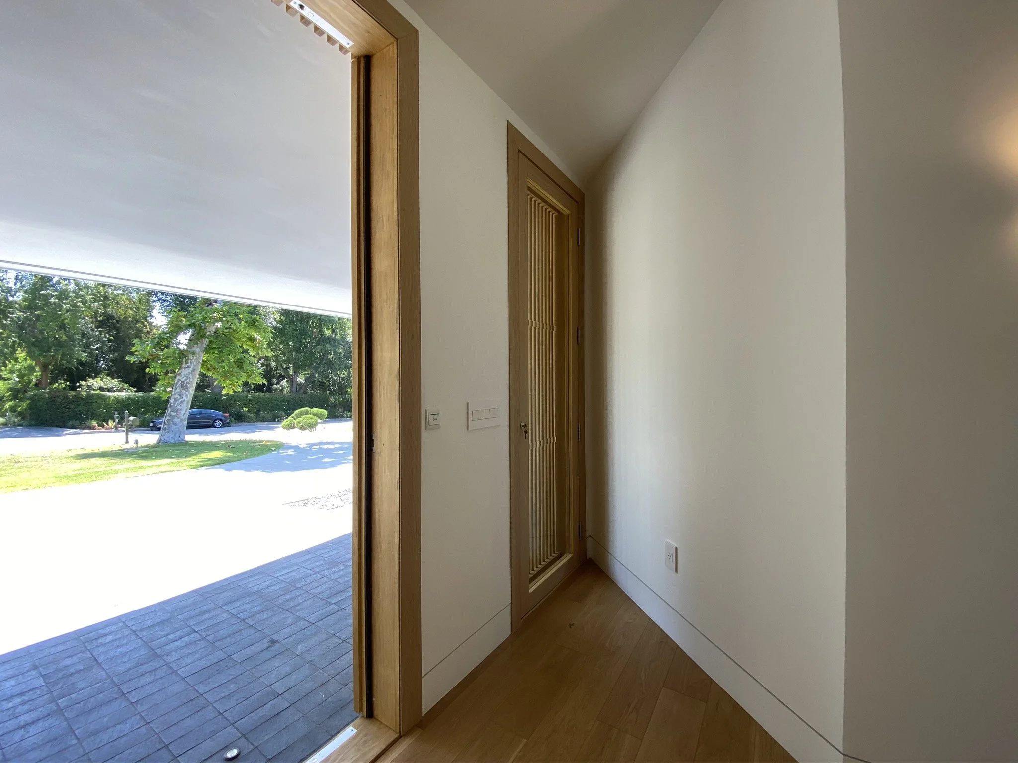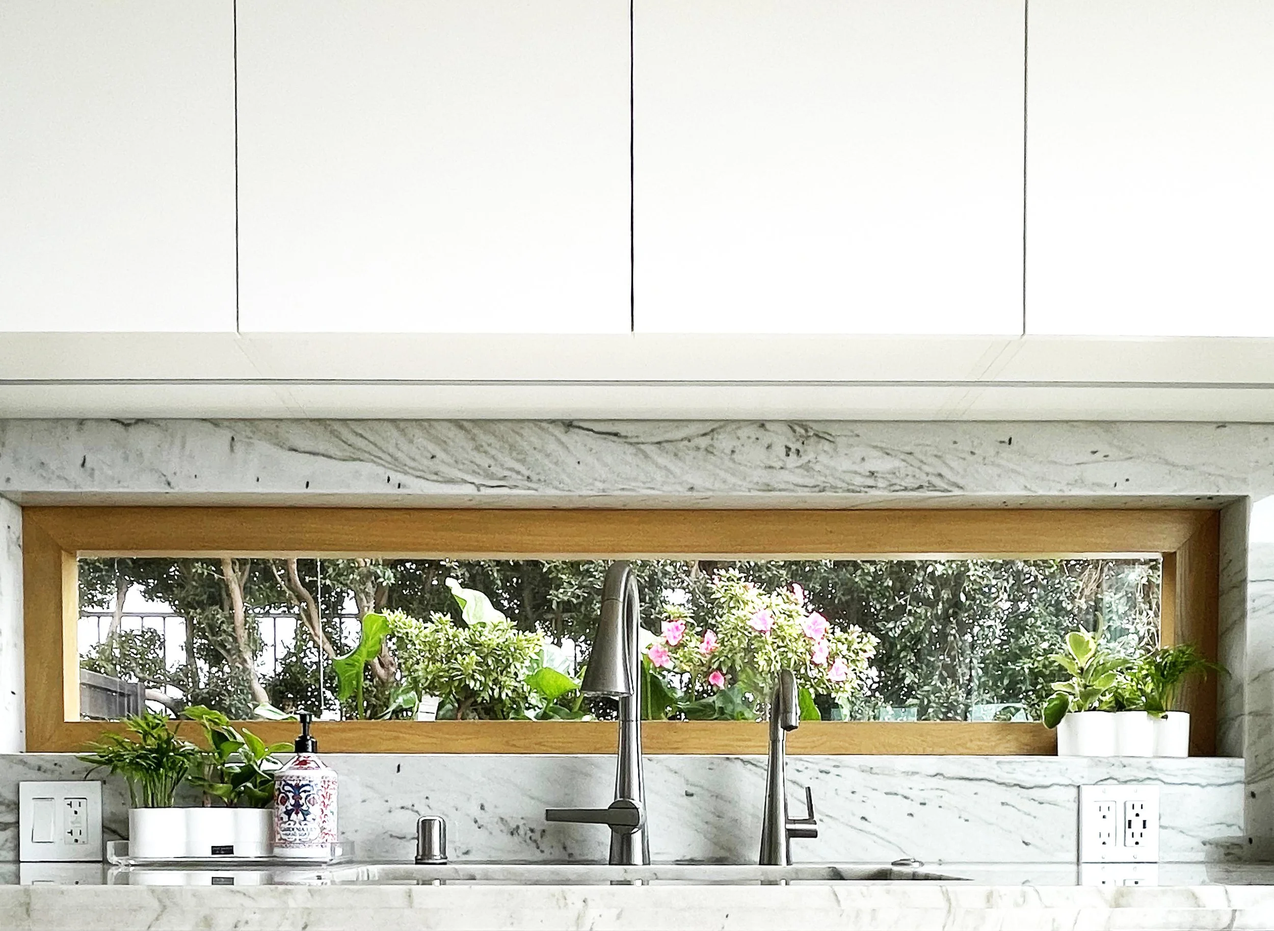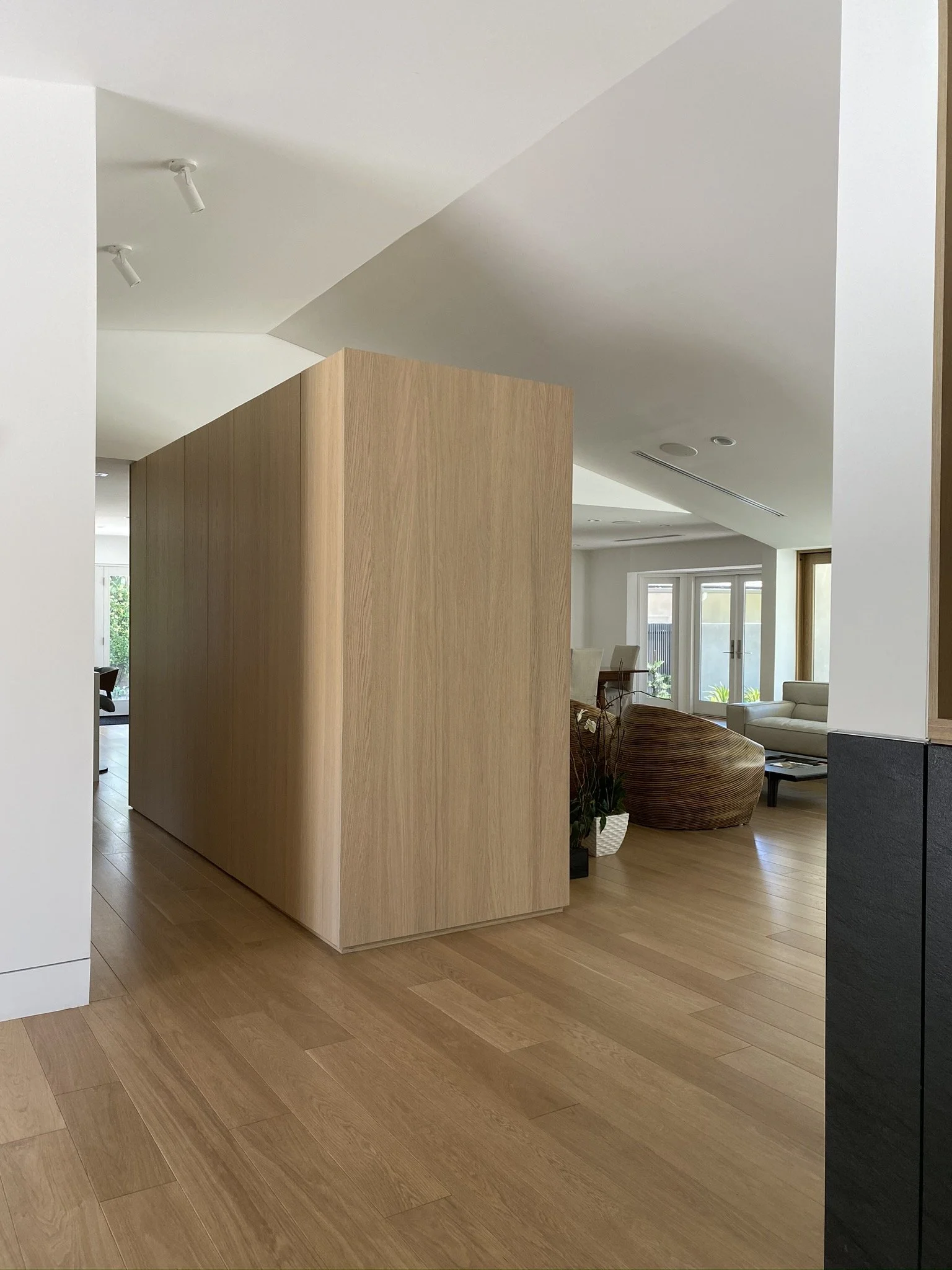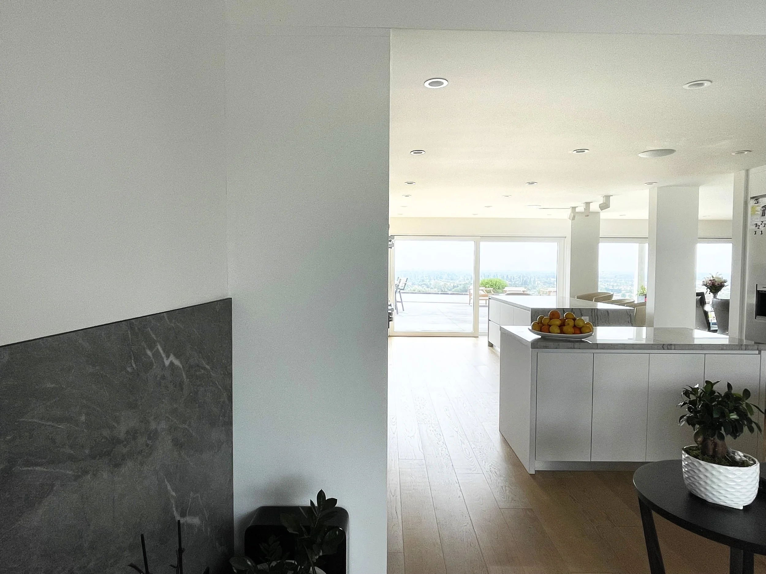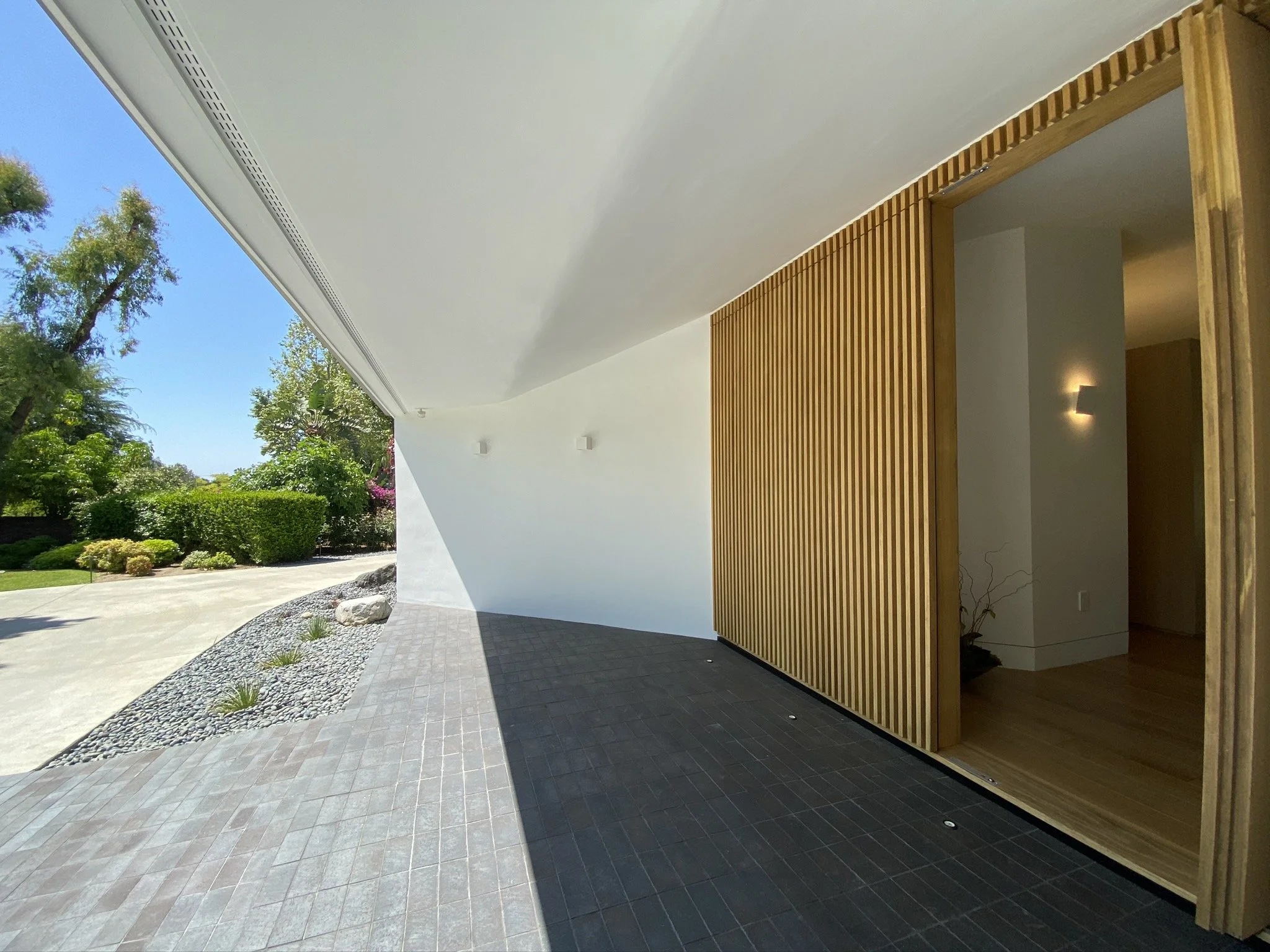 Tucked away in the Hollywood hills, this mid century gem is rearranged to showcase a roof resting on a series of white and travertine masses, leaving a sprawling space in-between. The owner wanted his new house to open up to nature at different scales. Through a 50 feet large patio slider or a peak through the roof, the openings are carefully sliced to capture a green backdrop, a blue sky, or a tip of a tree.