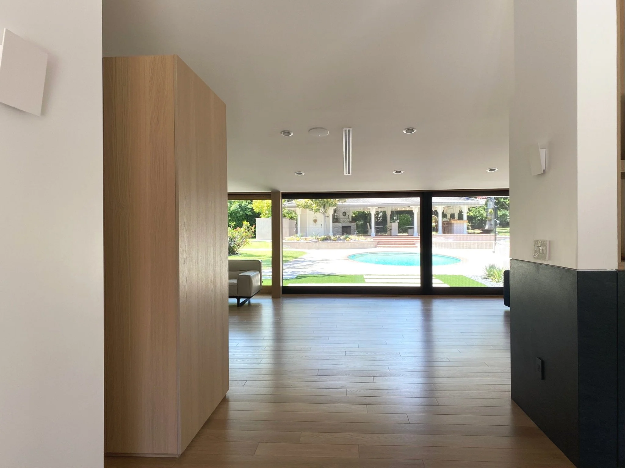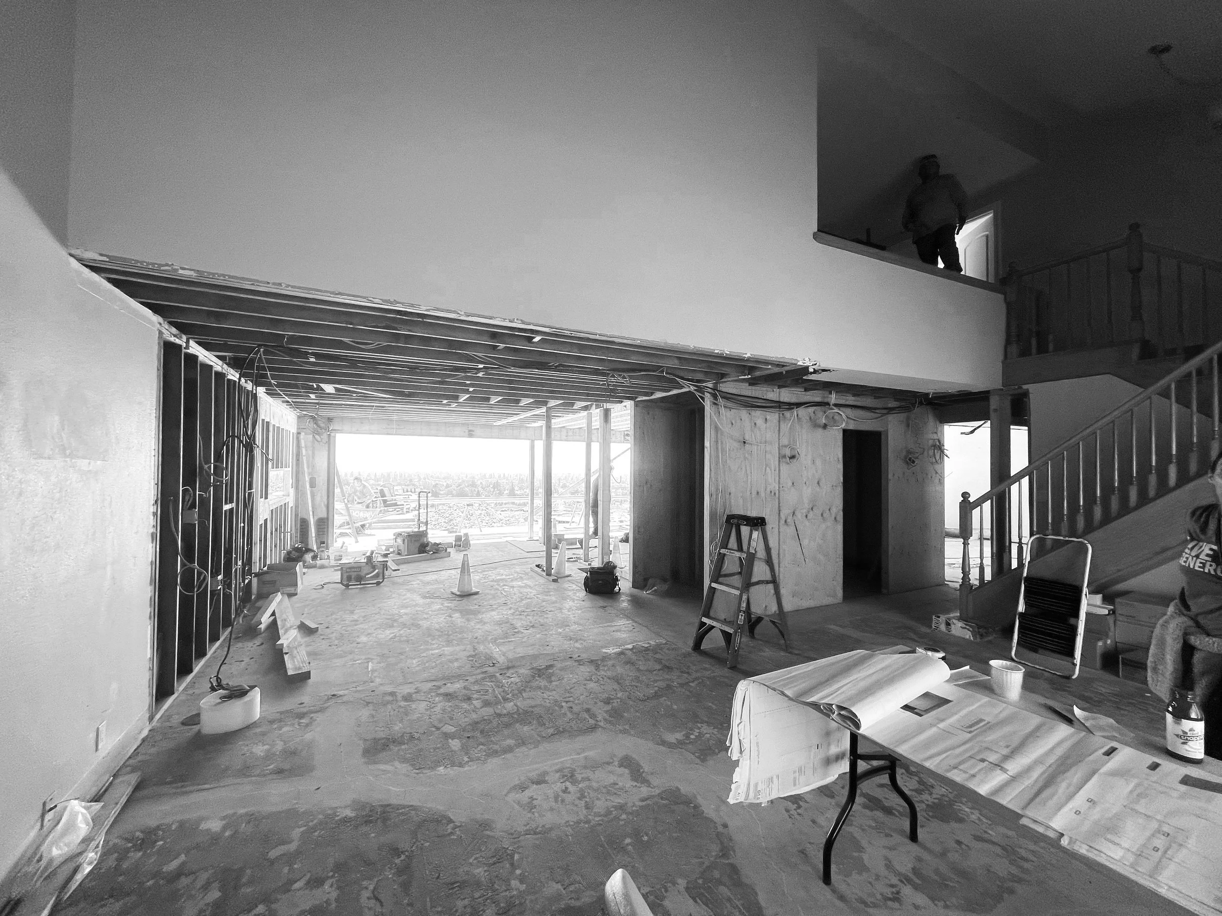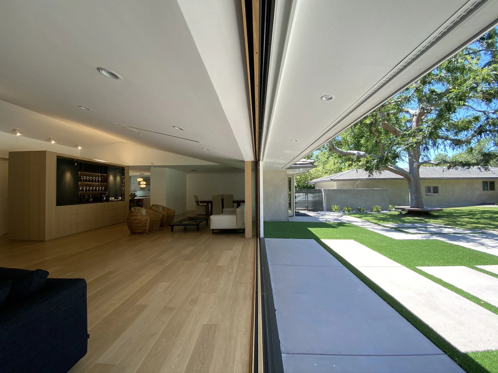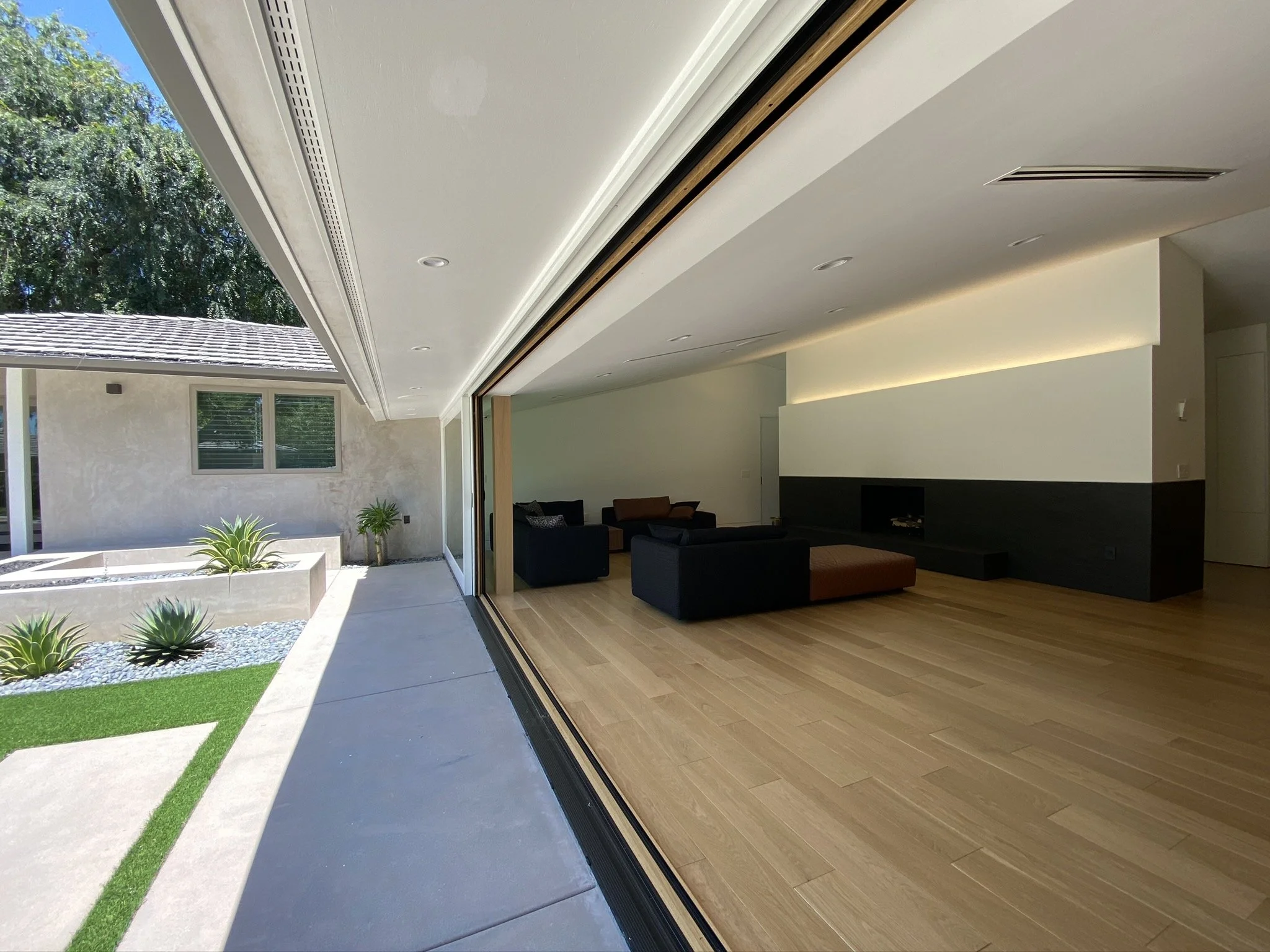 A living room and kitchen restructure grants maximum exposure to an uninterrupted view in Orange County. One large opening spanning the home width replaced the smaller punctures that came with this house. This remodel also includes a canopy addition to the backyard, and reimagining the porch and front access.