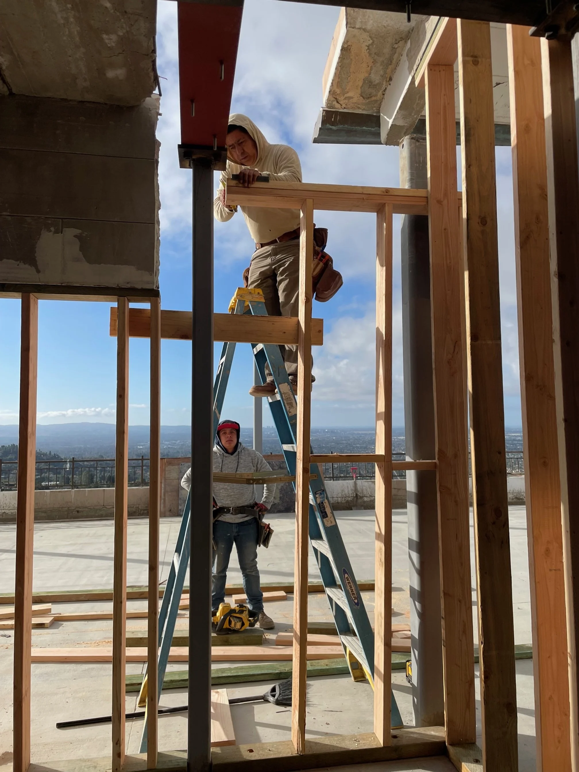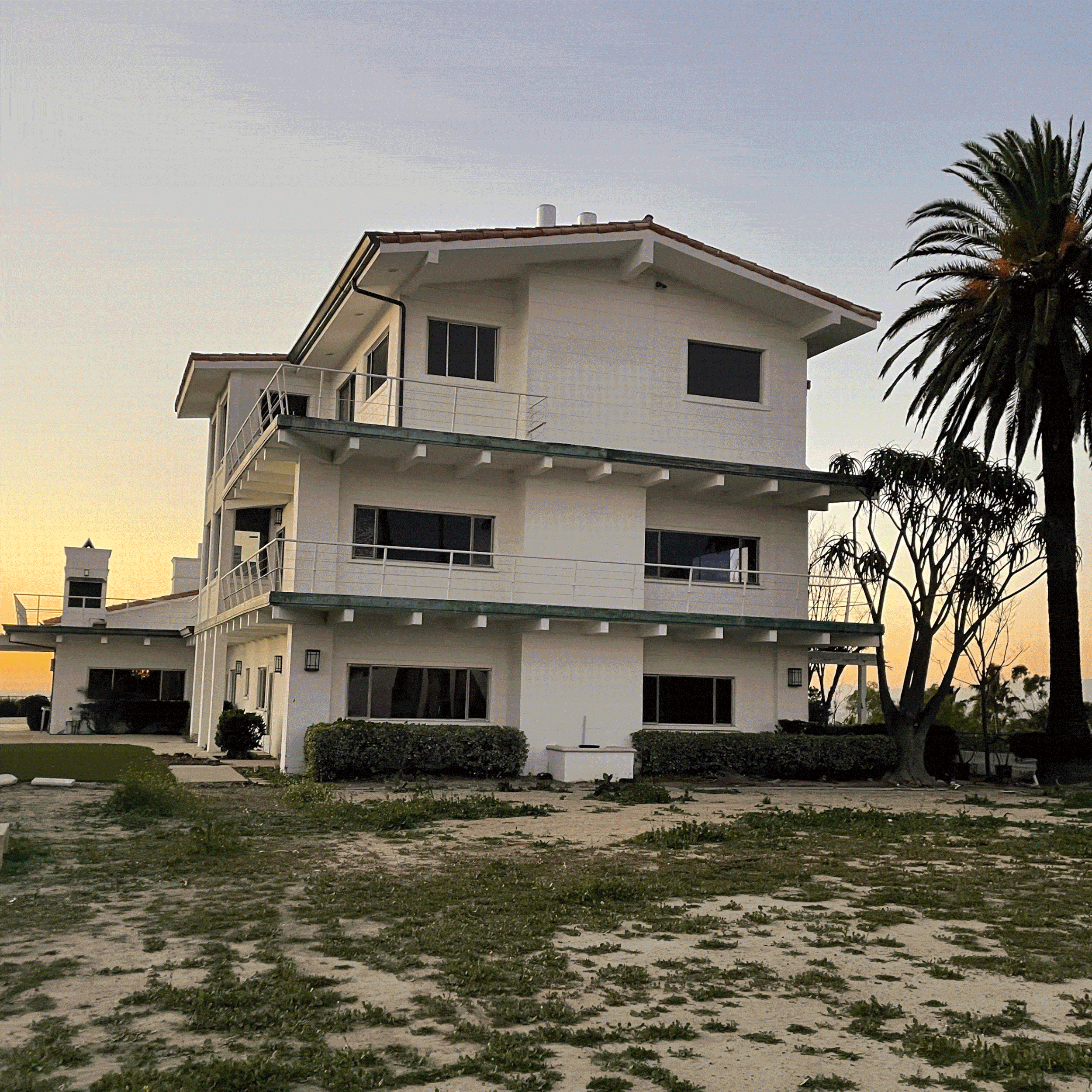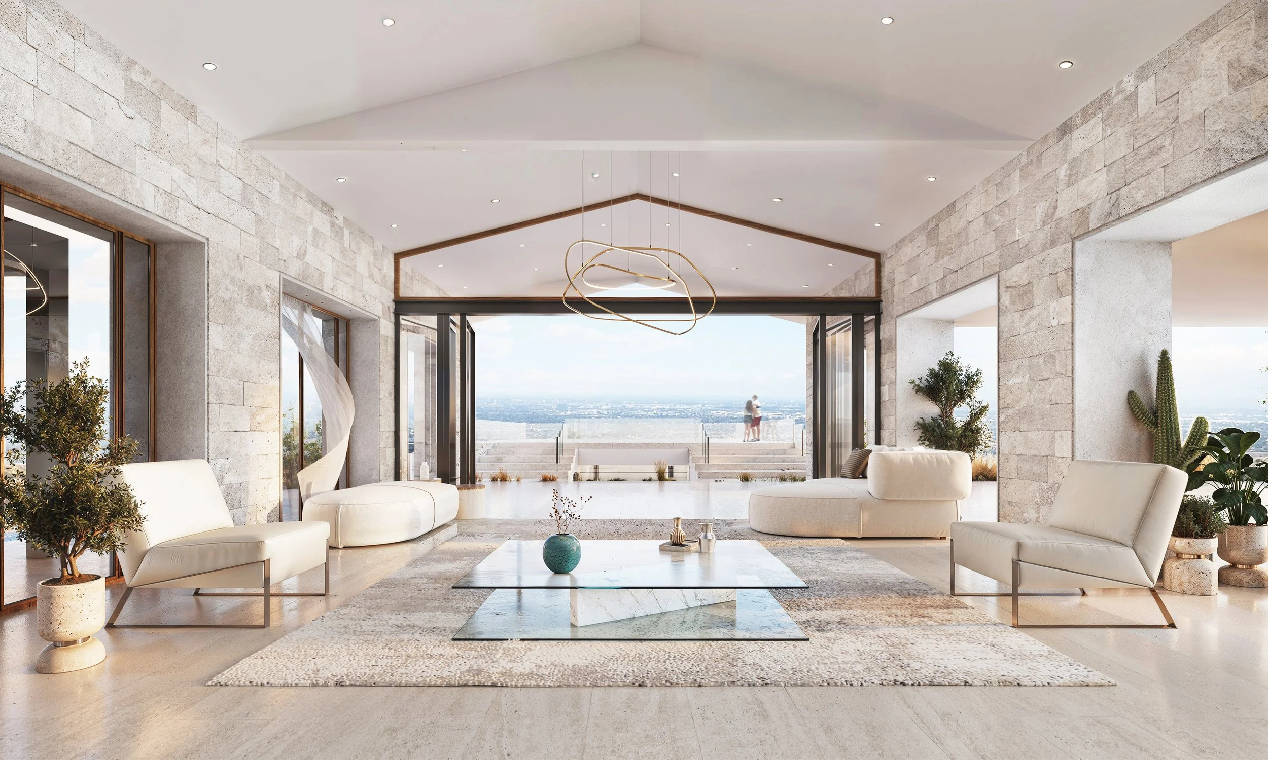 This 15,000-square-foot house sits at the top of a private hill with panoramic views from all corners. The remodel includes an extension to the living spaces, a sixth bedroom addition, and a lofted primary bedroom on the third floor. The upper two-story mass rests on a series of retaining walls containing the first floor.