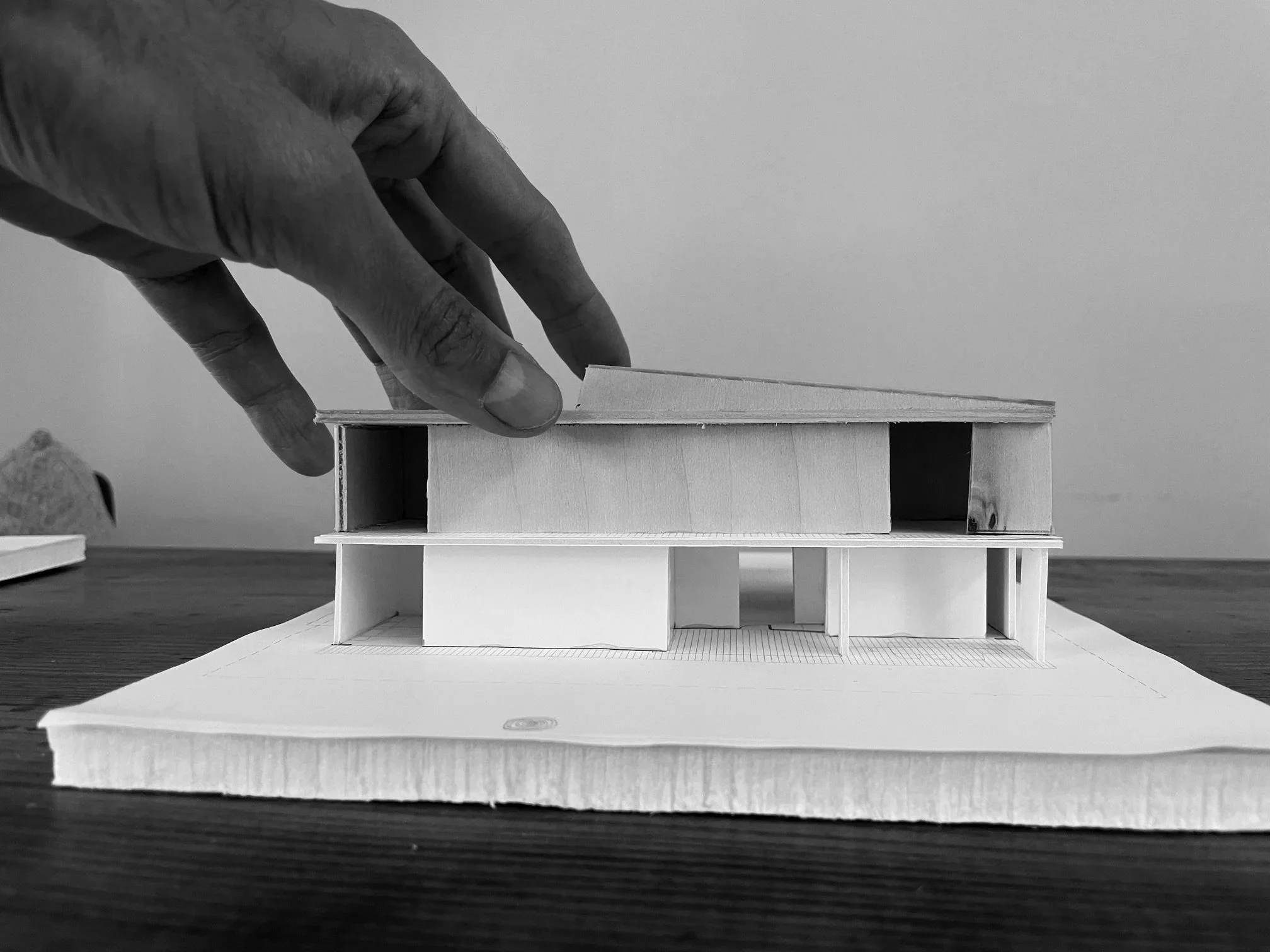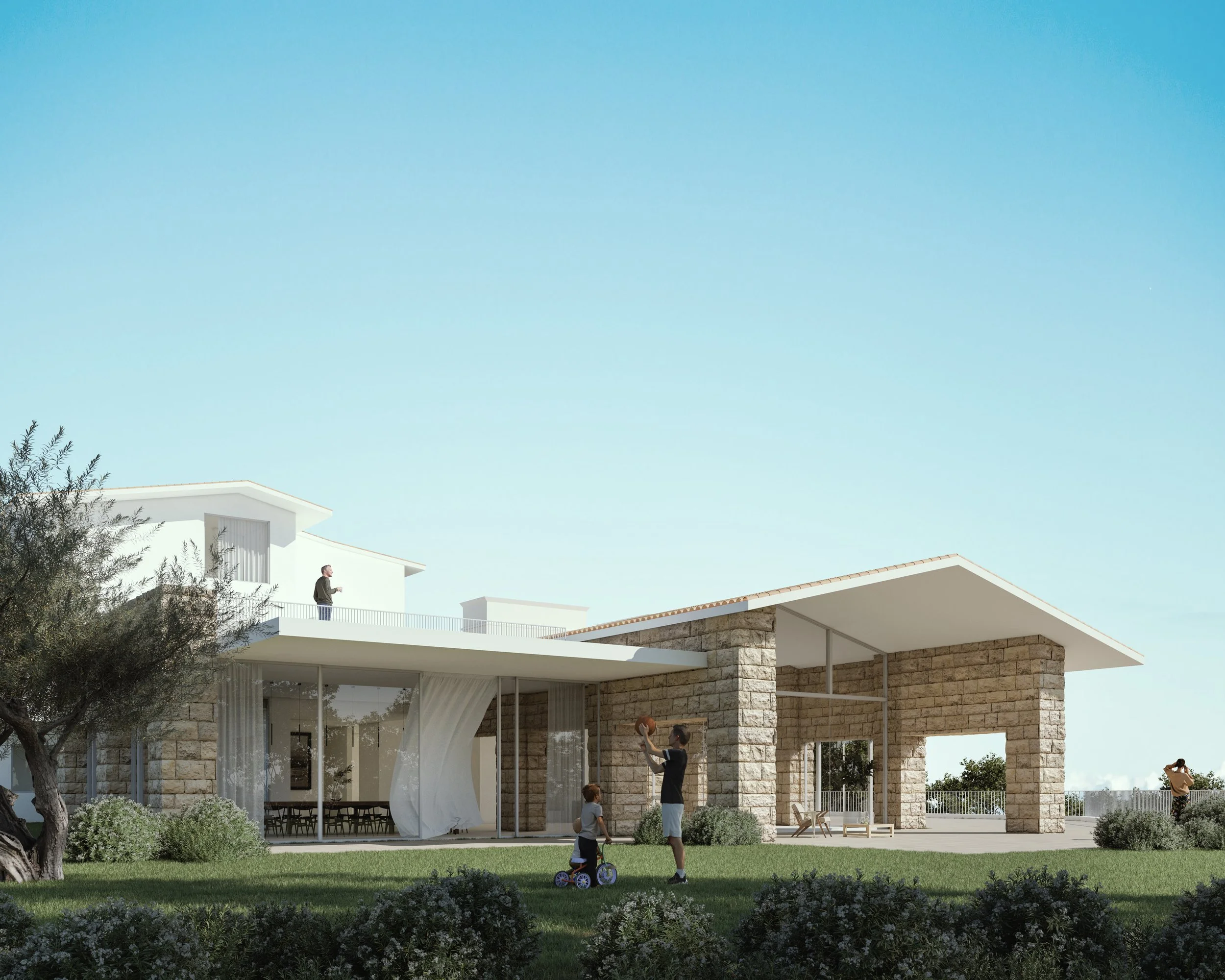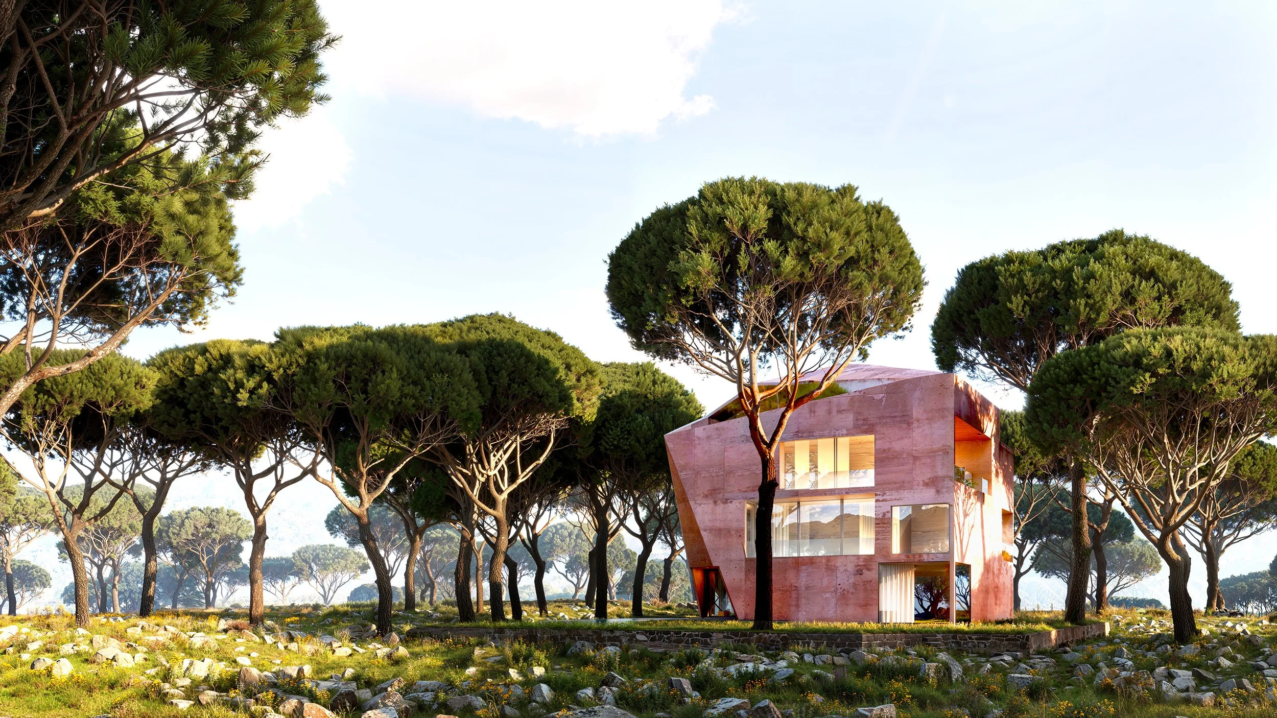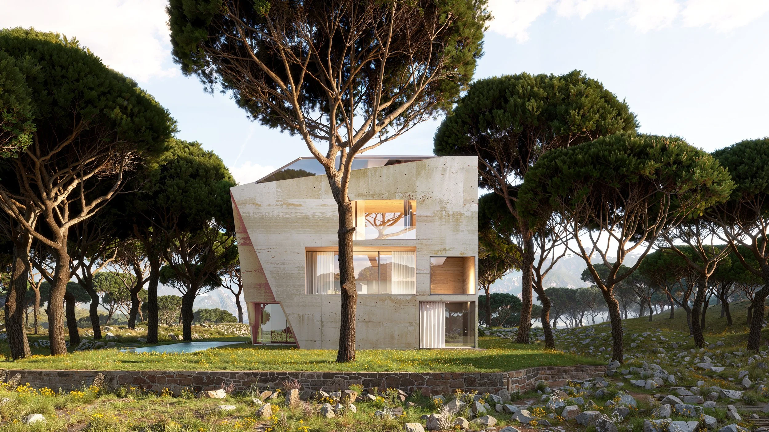 3 expat brothers came together to build a family pied-a-terre in their homeland. A property surrounded by pine trees would become their pilgrimage site. The building carved like a stone is their shelter, a reminder that what you leave behind sits strong waiting for your next visit.