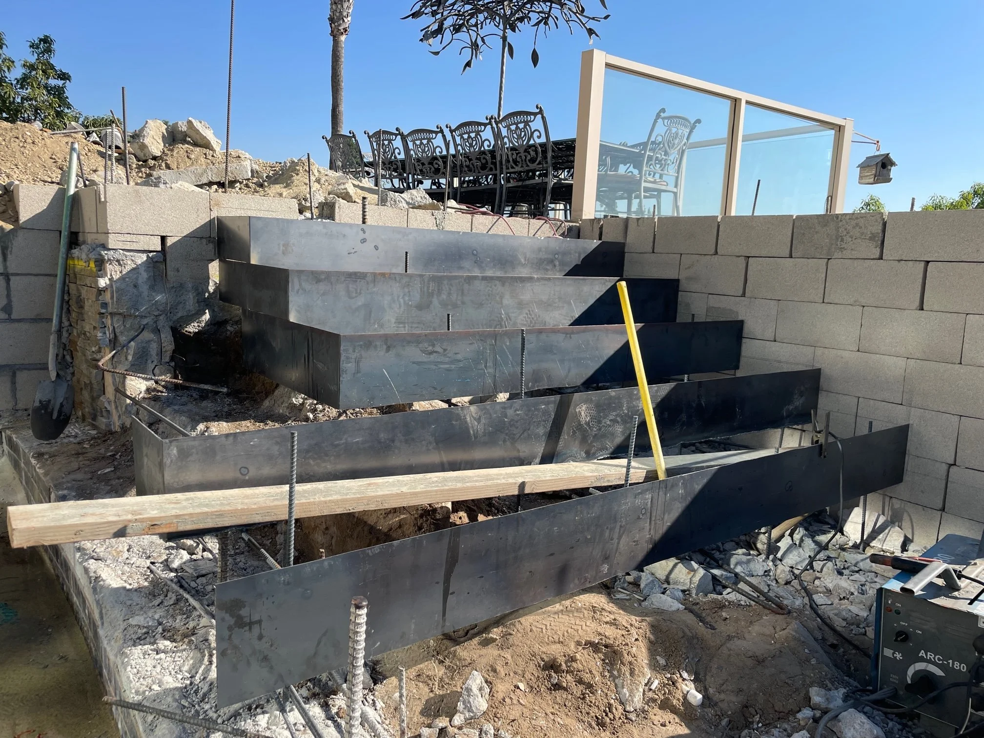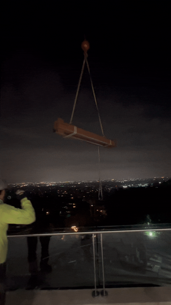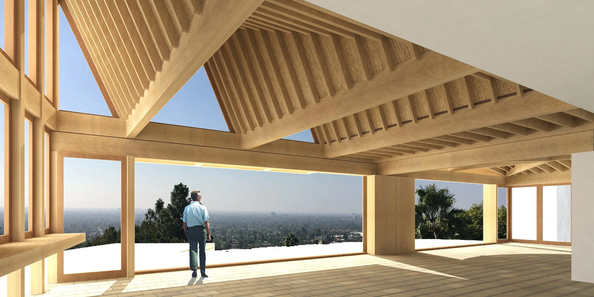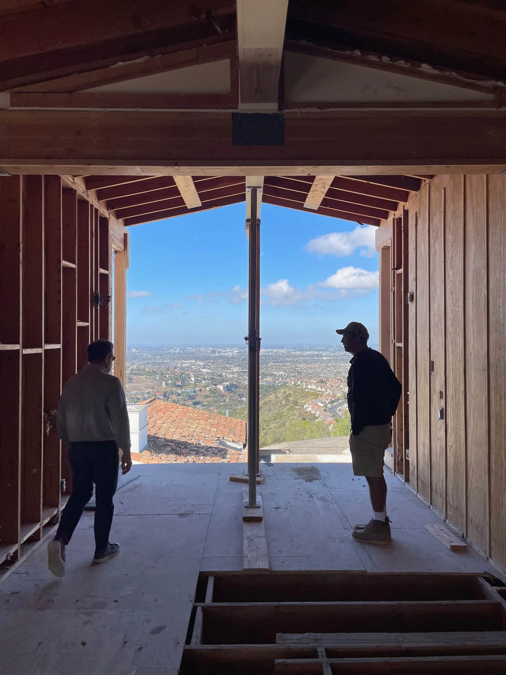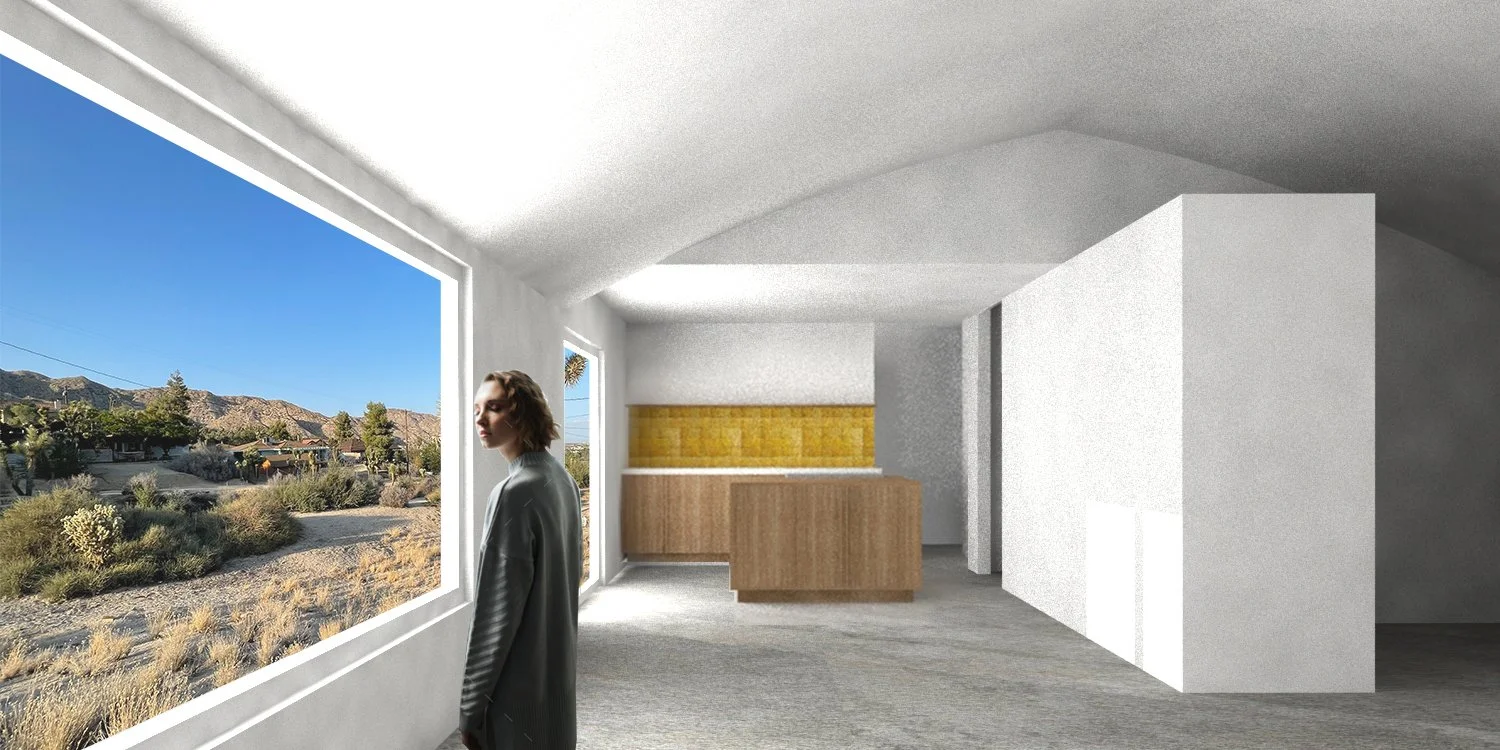 A 2,000-square-foot addition to a house nestled in the Santa Ana hills of California. It includes living and dining spaces with an industrial open kitchen and access to an outdoor patio and pool deck.